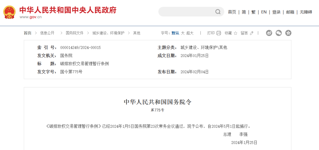 《碳排放權(quán)交易管理暫行條例》已經(jīng)2024年1月5日國務(wù)院第23次常務(wù)會議通過,現(xiàn)予公布,自2024年5月1日起施行。